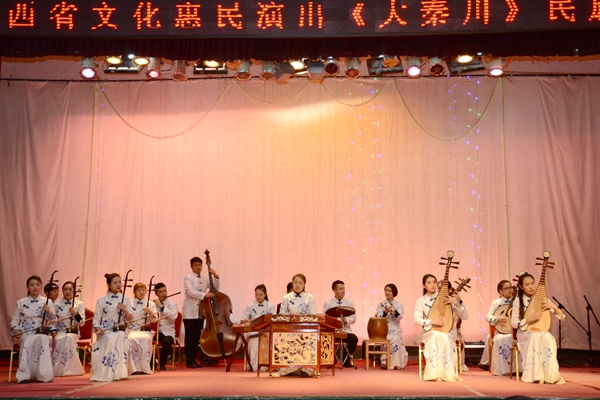 本次音樂會分民族器樂和聲樂表演兩大部分,既有充滿民族風情的秦腔、民歌演唱,又有板胡、二胡、嗩吶、笛子等民族特色樂器演奏。音樂會以一曲高昂、豪邁的二胡齊奏《戰(zhàn)馬奔騰》開場,《西部放歌》《秦腔牌子曲》《秦川抒懷》、《大秦川》《花好月圓》等曲目次第登場。其旋律時而柔和,時而歡快,時而磅礴,時而激昂。歌唱家們以其深厚的唱功,高亢的音調、優(yōu)美的音色,豐富的感情將歌曲中的豪放粗獷、激情澎湃、蕩氣回腸等特色表現(xiàn)得淋漓盡。演奏家們高超的技藝,將二胡、琵琶、嗩吶等民族樂器發(fā)揮到極致,帶領觀眾們領略中華傳統(tǒng)民族音樂的風情。在一首壯懷激烈的民族管弦樂《好漢歌》中,音樂會圓滿落下帷幕。