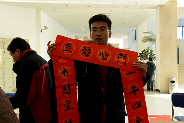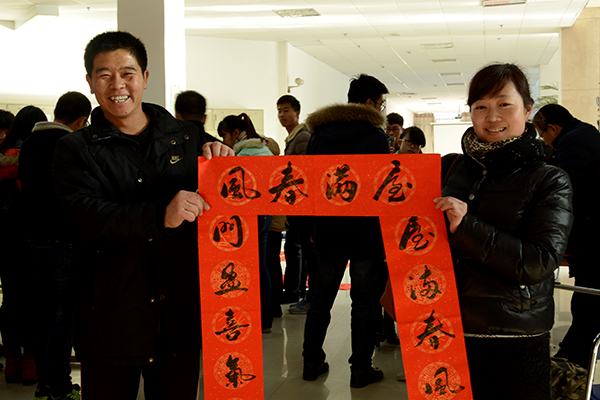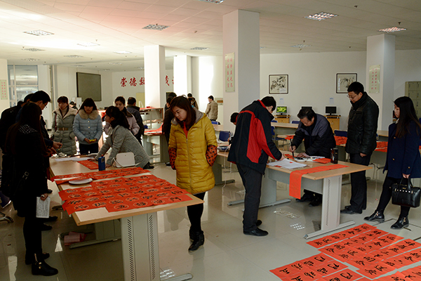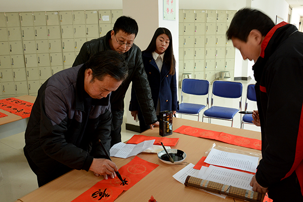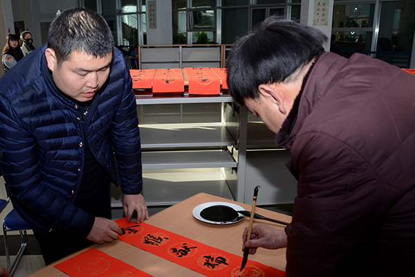 為了弘揚(yáng)中華民族傳統(tǒng)文化,豐富校園文化生活,營造歡樂的節(jié)日氛圍,1月14日-15日,校工會(huì)聯(lián)合學(xué)校書法家協(xié)會(huì)舉辦了“迎新春 送春聯(lián)”活動(dòng)。我校書法家協(xié)會(huì)主席李尚民,書法家協(xié)會(huì)會(huì)員李中合、劉全民、王思根、黃新春、葉玉印、祁志華等在圖書館大廳鋪開紅紙和筆墨,為師生們書寫、贈(zèng)送春聯(lián)。
