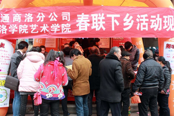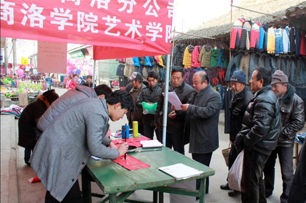 “金猴獻(xiàn)禮家家順利 喜鵲鬧春事事吉祥”,伴隨著新年腳步的臨近,1月16日至26日,由我校藝術(shù)學(xué)院師生組成的寒假社會(huì)實(shí)踐活動(dòng)團(tuán)隊(duì)聯(lián)合商洛聯(lián)通公司,在全市四縣一區(qū)22個(gè)鄉(xiāng)鎮(zhèn)開展了“文化下鄉(xiāng)送春聯(lián)”活動(dòng)。