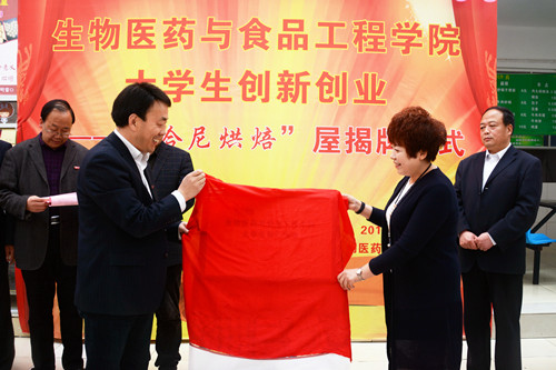 4月11日上午,由我校與陜西森弗天然制品有限公司合作的首個大學生創(chuàng)新創(chuàng)業(yè)項目——“哈尼烘焙”屋正式揭牌營業(yè)。校黨委副書記彭虎軍與陜西森弗天然制品有限公司總經(jīng)理金淑霞共同為“哈尼烘焙”屋揭牌。揭牌儀式由生物醫(yī)藥與食品工程學院黨總支副書記丁爭尚主持。
