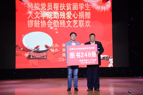 在“第26個(gè)助殘日”來(lái)臨之際,5月13日,人文社會(huì)科學(xué)學(xué)院與商洛市特殊教育學(xué)校聯(lián)合舉辦了慶?!暗?6個(gè)助殘日”愛心聯(lián)歡活動(dòng)。人文學(xué)院團(tuán)總支書記劉征文代表全院師生向商洛市特教學(xué)校捐贈(zèng)了248冊(cè)圖書,同學(xué)們與特教學(xué)校的孩子們、商洛市鑼鼓隊(duì)等愛心組織表演了精心準(zhǔn)備的節(jié)目。我校學(xué)生會(huì)干部在團(tuán)委相關(guān)負(fù)責(zé)人的帶領(lǐng)下參加了活動(dòng)。