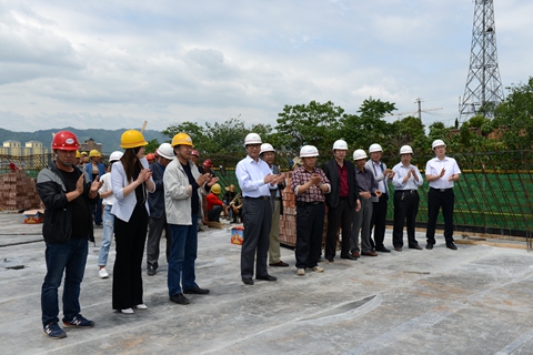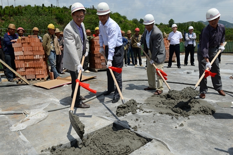 在儀式現場,劉寶盈及參加封頂儀式的代表們鏟起混凝土,共同為青年教師公寓和學生公寓樓封頂。