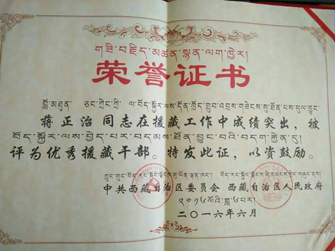 三年來,蔣正治以其優(yōu)良的工作作風(fēng),勤懇的工作態(tài)度,得到了援藏工作隊和受援單位的一致好評。2014年3月,蔣正治被評為陜西省優(yōu)秀援藏干部;2015年7月,被評為優(yōu)秀共產(chǎn)黨員;2014年、2015年連續(xù)兩年被評為中共阿里地委黨校優(yōu)秀教師;2016年被評為中共阿里地委黨校先進工作者;在援藏工作結(jié)束之際,他又被中共西藏自治區(qū)委員會、西藏自治區(qū)人民政府評為“優(yōu)秀援藏干部”,受到表彰。
