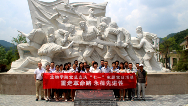 ——生物學院黨總支舉辦慶“七一”“重走革命路 永葆先進性” 活動。為慶祝中國共產(chǎn)黨建黨九十六周年華誕,6月29日,生物學院黨總支組織23名黨員赴商州區(qū)北寬坪鎮(zhèn)唐渠參觀商洛縣政府遺址、“中原突圍”紀念雕塑,開展“七一”主題活動,接受紅色革命再教育?;顒悠陂g,黨員們參觀了“中原突圍”紀念雕塑,重溫中原軍區(qū)沖破重重包圍,歷盡艱難,勝利地完成戰(zhàn)略轉(zhuǎn)移任務的革命事跡;隨后,參觀了商洛縣政府遺址,并舉行重溫入黨誓詞、合唱《沒有共產(chǎn)黨就沒有新中國》和黨的知識競答等活動。