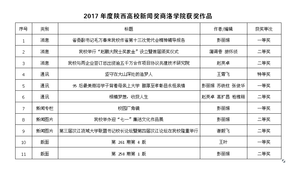 在2017年度陜西高校新聞獎(jiǎng)評(píng)選中,我校共有3件消息類作品、3件通訊類作品、1件新聞專欄類、2件新聞圖片類、2件版面類作品獲獎(jiǎng)。其中《省委副書記毛萬春來我校作省第十三次黨代會(huì)精神輔導(dǎo)報(bào)告》獲得消息類一等獎(jiǎng),《我校舉行“趙鵬大院士獎(jiǎng)教金”設(shè)立暨首屆頒獎(jiǎng)儀式》《我校與兩企業(yè)簽訂總出資逾五千萬合作項(xiàng)目協(xié)議共建技術(shù)研究院》獲得消息類二等獎(jiǎng);《堅(jiān)守在大山深處的追夢人》獲得通訊類特等獎(jiǎng),《95后最美商洛學(xué)子背著母親上大學(xué) 醇厚至孝彰顯永恒親情》獲得通訊類一等獎(jiǎng),《根植夢想,收獲人生》獲得通訊類二等獎(jiǎng);《校園廣角鏡》獲得新聞專欄類一等獎(jiǎng);《我校舉辦迎“七一”廉潔文化作品展》《第三屆漢江流域大學(xué)聯(lián)盟書記校長論壇暨第四屆漢江論壇在我校隆重舉行》獲得新聞圖片類二等獎(jiǎng);校報(bào)第261 期第 4 版獲得版面類一等獎(jiǎng),第258 期第 1 版獲得版面類二等獎(jiǎng)。