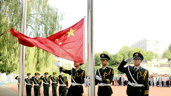 迎著清晨的第一縷陽光,國旗護(hù)衛(wèi)隊邁著鏗鏘有力的步伐護(hù)送鮮艷的五星紅旗至升旗臺。伴隨著激昂雄壯的國歌聲,五星紅旗冉冉升起,迎風(fēng)飄揚(yáng),全體師生肅立行注目禮,表達(dá)對國旗的尊敬和對祖國的熱愛。