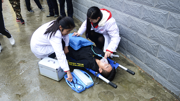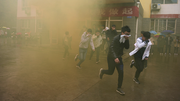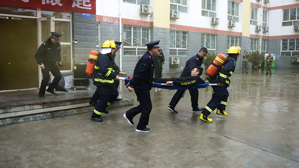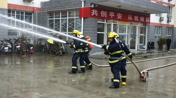 ?演練活動以我校一棟男生公寓樓起火為假設(shè)情景,共分為“逃生演練”“火場救援”和“滅火演示”三個部分。隨著指揮員一聲令下,模擬活動開始,“火災(zāi)現(xiàn)場”頓時濃煙滾滾,火險警報響起,4名同學(xué)從“火災(zāi)現(xiàn)場”逃離出來并大聲呼救。我校立刻啟動應(yīng)急預(yù)案,輔導(dǎo)員、公寓管理員、保衛(wèi)人員迅速趕到現(xiàn)場,引導(dǎo)學(xué)生有序疏散,師生開展“逃生演練”進行自救,并在第一時間撥打119火警電話。消防員接到報警后立即出動,駕駛消防車火速趕來。同學(xué)們聽從引導(dǎo),動作迅速,用濕毛巾捂住口鼻,彎腰靠右側(cè)從“失火”的樓道中有序撤離到指定安全區(qū)域。隨后,消防人員還模擬演練了“火場搜救被困學(xué)生”,醫(yī)護人員對“被搜救學(xué)生”模擬進行了“治療檢查”,消防支隊啟動消防車在火災(zāi)現(xiàn)場進行“滅火演示”。至此,在各相關(guān)部門的密切合作和全體同學(xué)的共同配合下,本次火災(zāi)應(yīng)急疏散與救援演練活動圓滿完成。