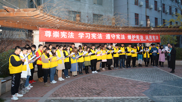 12月4日是我國第五個國家憲法日暨第18個全國法制宣傳日。今天早晨,我校在一號教學樓前舉行升國旗儀式并在莘子苑舉行憲法晨讀活動。校黨委宣傳部、團委負責人及相關人員,青馬班學員、健康管理學院學生代表參加活動。