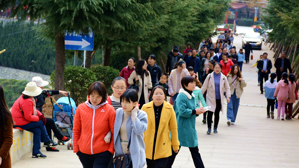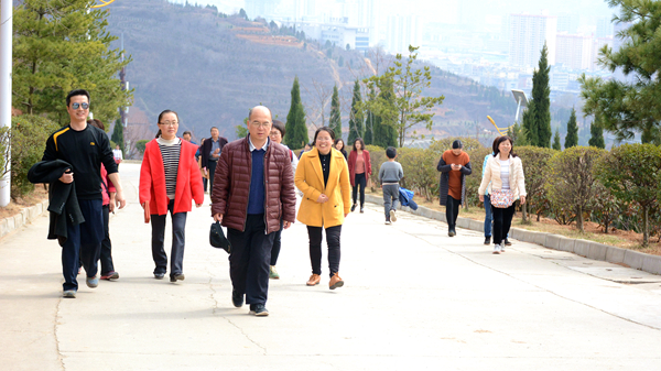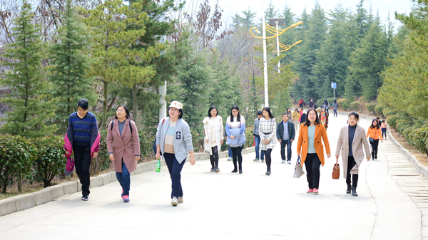 位于商洛市中心廣場北邊的金鳳山,有寬闊的水泥路和蜿蜒曲折的臺階通往山頂,參加活動的教職工們熱情高漲、意趣盎然,三五成群結(jié)伴而行,一邊呼吸著新鮮空氣,一邊飽覽自然美景,或大步流星拾級而上,或相互鼓勵穩(wěn)步前行,一路灑下歡歌笑語。待到山頂極目遠(yuǎn)眺,周邊風(fēng)景盡收眼底,美麗的丹江宛若玉帶穿城而過,一幢幢高樓沿江林立,一條條公路向遠(yuǎn)方延伸,春風(fēng)伴著美景,令人心曠神怡,大家紛紛合影留念,定格快樂。