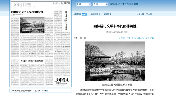 我校人文學(xué)院教師李小奇在《光明日報》2019年7月29日文史哲周刊發(fā)表學(xué)術(shù)文章《園林游記文學(xué)書寫的園林特性》,全文如下: