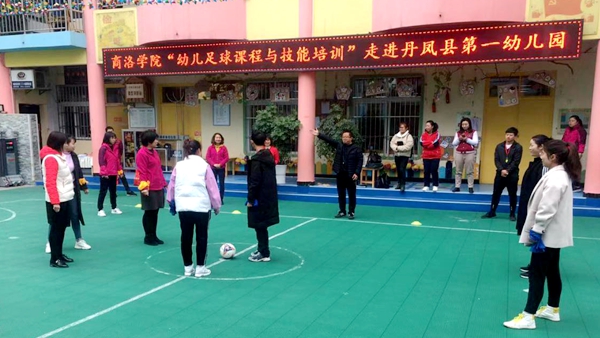 為進一步做好結對幫扶助力丹鳳脫貧攻堅工作,推進丹鳳縣幼兒足球示范園建設,我校與丹鳳縣科教體局于11月20日在丹鳳縣第一幼兒園共同舉辦了“幼兒足球課程與技能培訓”活動。我?!半p百工程”項目首席專家朱小強,體育教學研究部足球教師楊斌,丹鳳縣農業(yè)農村局、科教體局相關人員,丹鳳縣5所示范園和5所民辦幼兒園負責人及相關教師參加了此次活動。
