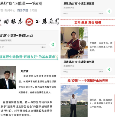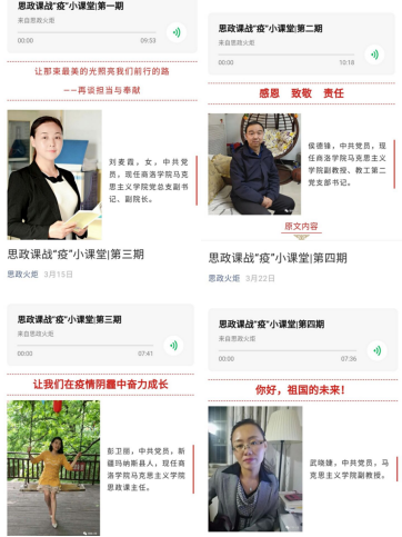 為貫徹落實(shí)習(xí)近平總書記關(guān)于新冠肺炎疫情防控工作的重要講話和指示精神,全力支持配合打贏疫情防控戰(zhàn)、總體戰(zhàn)、阻擊戰(zhàn),按照教育部黨組“停課不停教、停課不停學(xué)”的要求,積極響應(yīng)教育部舉辦的高校“思政課戰(zhàn)役小課堂”專項(xiàng)活動,助力思政課線上教學(xué),我校馬克思主義學(xué)院通過微信公眾號開辦了“思政課戰(zhàn)疫小課堂”專題欄目,組織學(xué)院教師錄制思政微課,通過文字、圖片加音頻的形式定期向?qū)W生推送,同時(shí)還通過學(xué)校官方微信公眾號進(jìn)行推送,以擴(kuò)大學(xué)生覆蓋面。目前,“思政課戰(zhàn)役小課堂”已經(jīng)發(fā)布7期內(nèi)容,獲得了師生廣泛關(guān)注,進(jìn)一步激發(fā)了師生從我做起、助力抗疫的積極性和自覺性,堅(jiān)定了青年一代勇?lián)鷷r(shí)代使命的決心和信心。