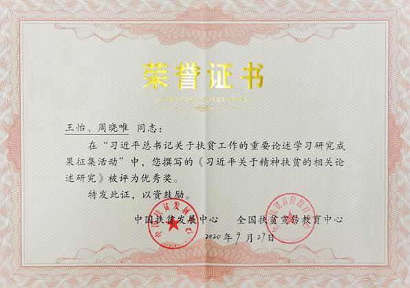 9月27日,由國務(wù)院扶貧辦中國扶貧發(fā)展中心、全國扶貧宣傳教育中心和西安交通大學(xué)聯(lián)合主辦的“習(xí)近平總書記扶貧論述研究成果征集交流研討會暨習(xí)近平總書記扶貧論述系列研究工作結(jié)項會”在北京會議中心召開。會議公布了習(xí)近平總書記扶貧論述研究成果征集獲獎名單并頒獎,商洛市脫貧“阻返”長效機制研究團隊負責(zé)人、我校教授王怡主持完成的《習(xí)近平關(guān)于精神扶貧的相關(guān)論述研究》榮獲優(yōu)秀獎。