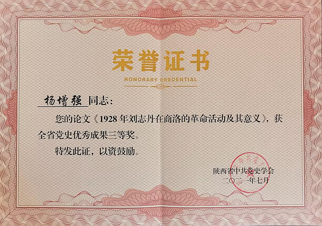 黨史學(xué)習(xí)教育開(kāi)展以來(lái),陜西省中共黨史學(xué)會(huì)在全省范圍內(nèi)開(kāi)展了研究成果評(píng)獎(jiǎng)活動(dòng)。我校楊增強(qiáng)教授的論文《1928年劉志丹在商洛的革命活動(dòng)及其意義》在評(píng)選活動(dòng)中獲得全省黨史優(yōu)秀成果三等獎(jiǎng)。