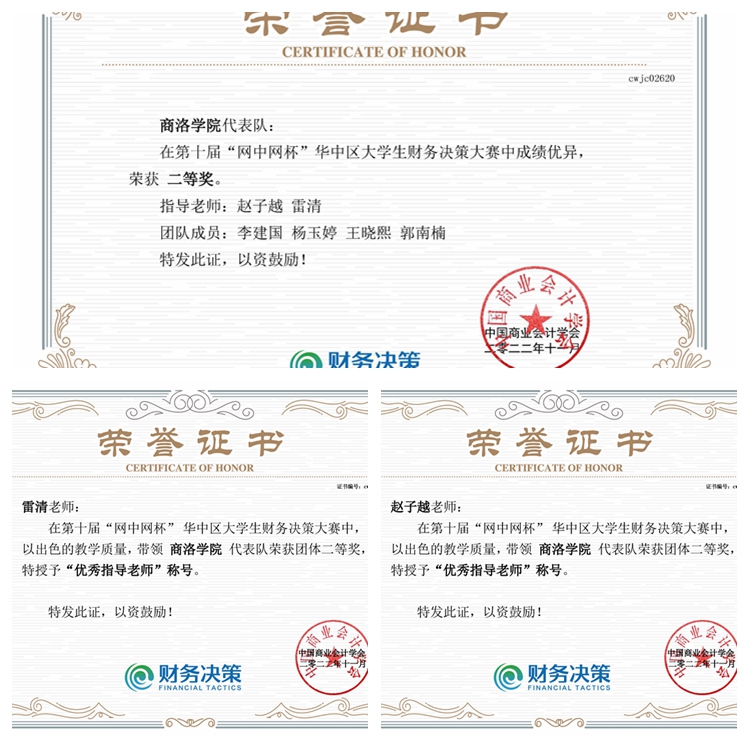 第十屆“網(wǎng)中網(wǎng)杯”大學(xué)生財務(wù)決策大賽由中國高等教育學(xué)會高等財經(jīng)教育分會指導(dǎo),中國商業(yè)會計學(xué)會主辦,廈門網(wǎng)中網(wǎng)軟件有限公司等單位提供技術(shù)支持,全國共有372所本科院校參賽。我校經(jīng)濟管理學(xué)院李建國、楊玉婷、王曉熙、郭南楠4名學(xué)生獲得華中區(qū)團體二等獎,雷清、趙子越榮獲“優(yōu)秀指導(dǎo)教師”稱號。