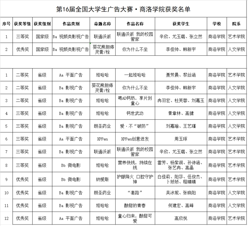 本屆大賽,我校學(xué)子以獨到的創(chuàng)意、精妙的設(shè)計,在激烈的競賽中脫穎而出,斬獲國家級獎項2項、省級獎項12項,商洛學(xué)院被全國大學(xué)生廣告藝術(shù)大賽組委會授予“優(yōu)秀院?!保瑮铎o被授予“優(yōu)秀組織工作者”,逯祺、李桐、張玉英、馬英群被授予“優(yōu)秀指導(dǎo)教師”。張文諾、王淦卿、戴銘武、王曦茜、蔡波、張坤、和錦慧、楊曉照被評為本屆大廣賽校級“優(yōu)秀指導(dǎo)教師”。