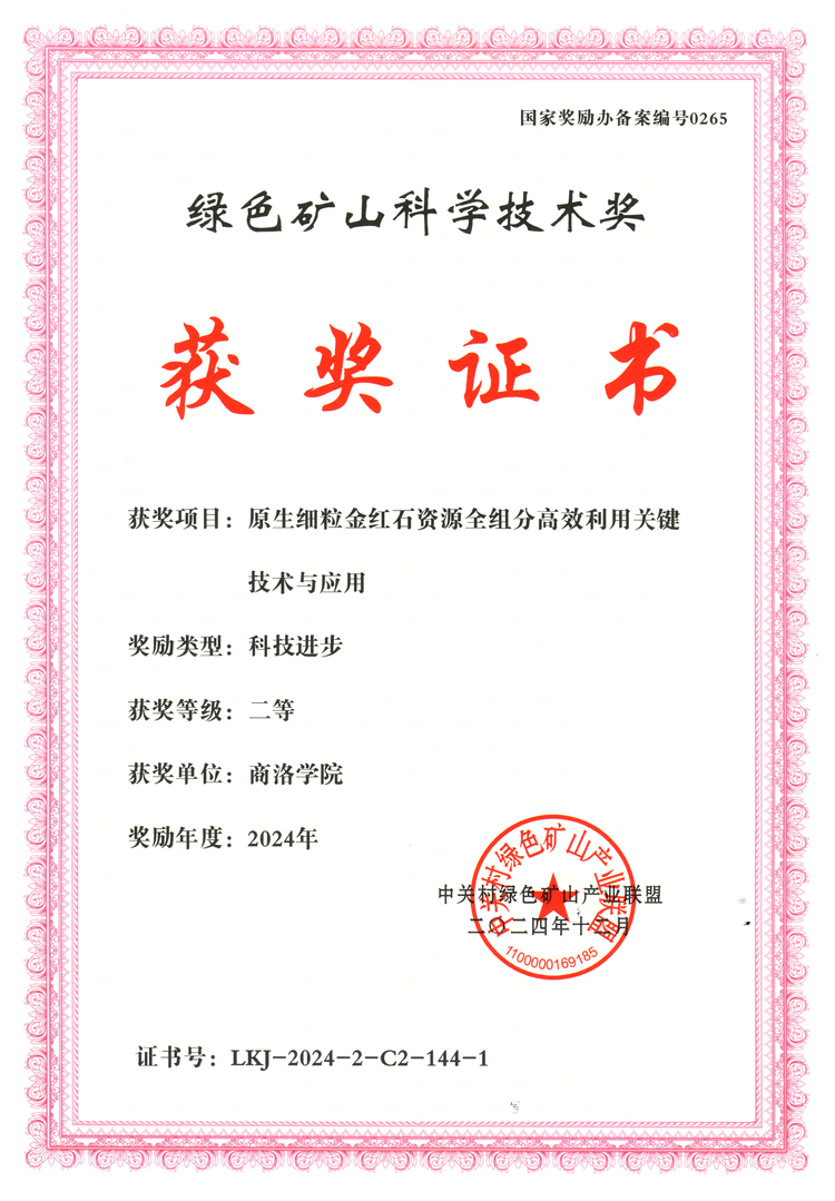 據(jù)悉,綠色礦山科學(xué)技術(shù)獎(國家獎勵辦備案編號0265)是國家獎勵辦于2015年正式批準,旨在對綠色礦產(chǎn)勘查、綠色礦業(yè)發(fā)展和礦山建設(shè)中引領(lǐng)行業(yè)進步、樹立行業(yè)標桿、推動學(xué)科發(fā)展及關(guān)鍵核心技術(shù)研發(fā)過程中做出突出貢獻的單位和個人予以表彰。這一獎項的獲得,充分肯定了我校在推動秦嶺域內(nèi)礦產(chǎn)資源綠色精深開發(fā)科技進步方面的突出貢獻,有力彰顯了我校在綠色礦山建設(shè)領(lǐng)域的行業(yè)影響力。
