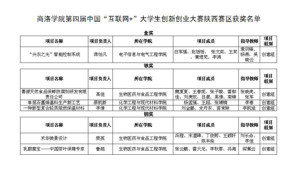 自2015年“互聯(lián)網(wǎng)+”大賽開展以來,我校把大賽作為應(yīng)用型人才培養(yǎng)的重要平臺,積極開展教學(xué)改革探索,把創(chuàng)新創(chuàng)業(yè)教育融入人才培養(yǎng),切實(shí)提高學(xué)生的創(chuàng)新精神、創(chuàng)業(yè)意識和創(chuàng)新創(chuàng)業(yè)能力。學(xué)校制定了《商洛學(xué)院學(xué)生創(chuàng)新創(chuàng)業(yè)教育實(shí)施方案》《商洛學(xué)院學(xué)生創(chuàng)新創(chuàng)業(yè)學(xué)分認(rèn)定辦法》,建立了由54名教師組成的校級創(chuàng)新創(chuàng)業(yè)教育專家?guī)?,建有校級和院級眾?chuàng)空間,培育、孵化創(chuàng)新創(chuàng)業(yè)項(xiàng)目,對先進(jìn)集體、優(yōu)勝團(tuán)隊(duì)及標(biāo)兵、優(yōu)秀指導(dǎo)教師等進(jìn)行表彰獎(jiǎng)勵(lì)。為做好本屆大賽各項(xiàng)工作,我校成立了以校長為組長的校賽組委會(huì),制定具體實(shí)施方案,鼓勵(lì)激勵(lì)廣大學(xué)生積極參加。針對288個(gè)參賽項(xiàng)目,學(xué)校聘請校外專家對項(xiàng)目負(fù)責(zé)人及指導(dǎo)教師進(jìn)行了多輪培訓(xùn),對項(xiàng)目精心打磨。經(jīng)過二級學(xué)院院內(nèi)賽和校內(nèi)預(yù)賽、初賽、決賽,評選出校級金獎(jiǎng)10項(xiàng)、銀獎(jiǎng)20項(xiàng)、銅獎(jiǎng)30項(xiàng)。在暑假期間,教務(wù)處組織校級10項(xiàng)金獎(jiǎng)項(xiàng)目負(fù)責(zé)人和指導(dǎo)教師進(jìn)行封閉訓(xùn)練,遴選9個(gè)項(xiàng)目代表學(xué)校參加陜西省復(fù)賽,最終6項(xiàng)獲獎(jiǎng)。