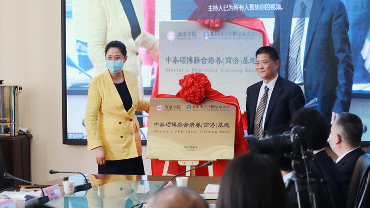 在與會成員的見證下,范新會和席拉特分別代表商洛學院和泰國國立莊棚皇家大學簽署教育合作協(xié)議,并和孫蓉為聯(lián)合培養(yǎng)基地揭牌。