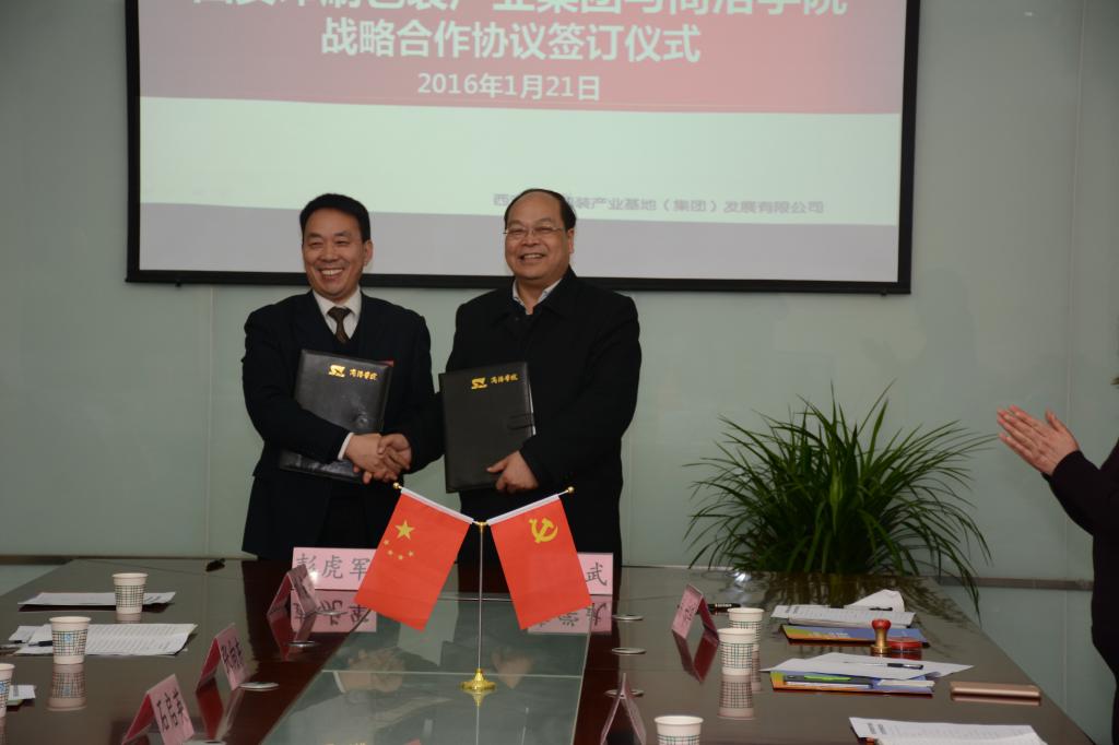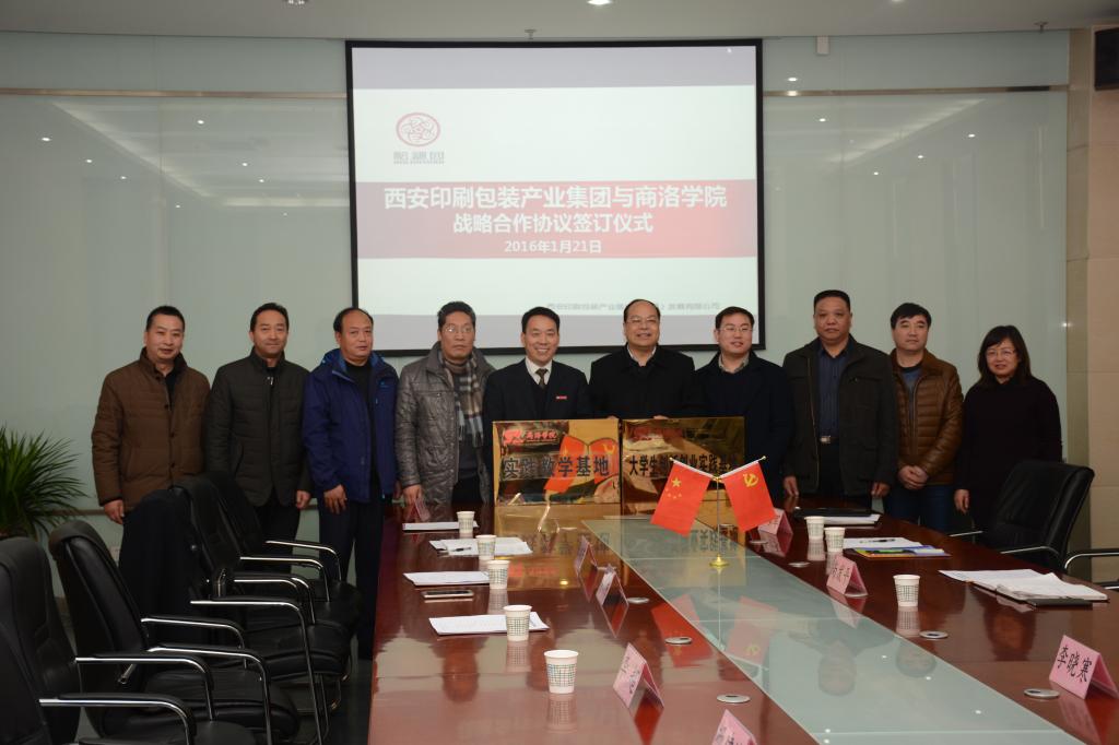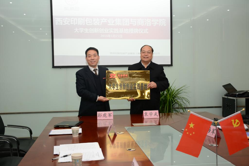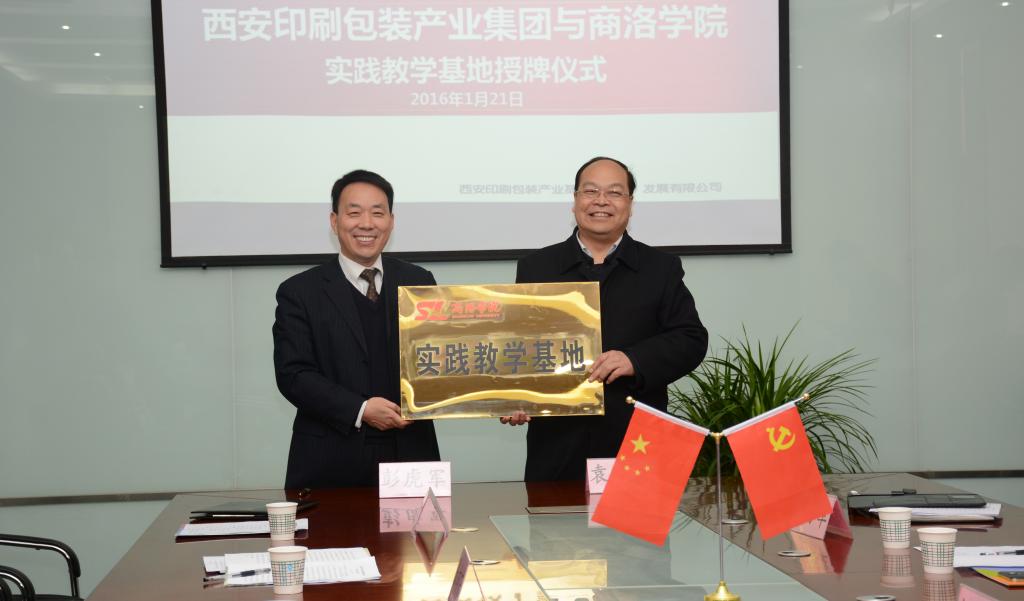 2016年1月21日,我校與西安印刷包裝產(chǎn)業(yè)集團(tuán)在西安經(jīng)濟(jì)技術(shù)開發(fā)區(qū)草灘生態(tài)產(chǎn)業(yè)園簽署戰(zhàn)略合作協(xié)議并舉行授牌儀式。校黨委副書記彭虎軍與西安印刷包裝產(chǎn)業(yè)集團(tuán)董事長袁學(xué)武代表校企雙方在協(xié)議上簽字。彭虎軍在簽約儀式之后向西安印刷包裝產(chǎn)業(yè)集團(tuán)授予“商洛學(xué)院大學(xué)生創(chuàng)新創(chuàng)業(yè)實(shí)踐基地”和“商洛學(xué)院教學(xué)實(shí)踐基地”牌。學(xué)校黨政辦公室、教務(wù)處、學(xué)生處、招生就業(yè)處等部門領(lǐng)導(dǎo),西安印刷包裝產(chǎn)業(yè)集團(tuán)黨總支副書記劉海軍及集團(tuán)有關(guān)部門人員參加了簽約授牌儀式。簽約授牌儀式由劉海軍主持。