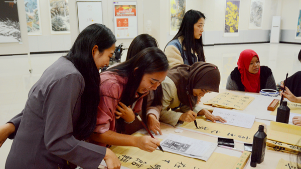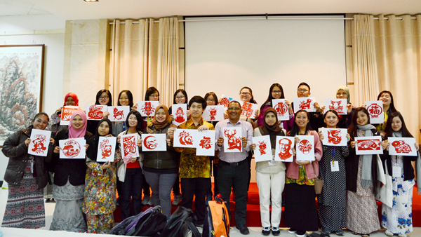 16日下午,交流團(tuán)師生聽取了中國傳統(tǒng)禮儀課,并與我校師生共同探討、展示了中馬兩國不同的禮儀;之后在我校教師的指導(dǎo)下學(xué)習(xí)中國書法和剪紙。他們在課堂上呈現(xiàn)出了濃厚的興趣和極高的熱情,并通過學(xué)習(xí),完成了自己的書法和剪紙作品。