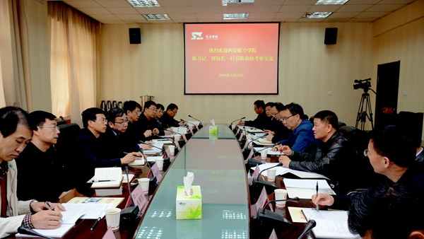 3月29日,西安航空學(xué)院黨委書(shū)記陳平社、校長(zhǎng)曹慶年、副校長(zhǎng)宋文學(xué)等一行9人來(lái)我??疾旖涣鞴ぷ鳌P|h委書(shū)記龍治剛、校長(zhǎng)范新會(huì)熱情接待了陳平社、曹慶年一行。