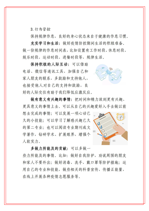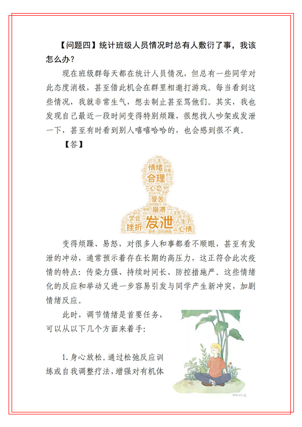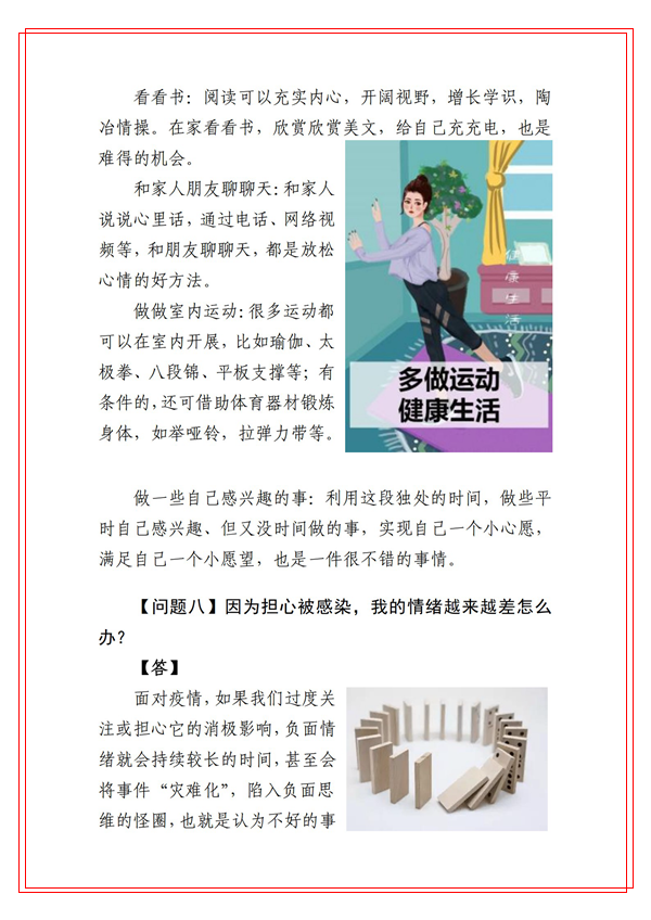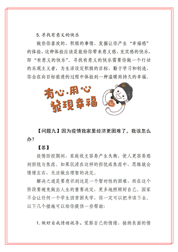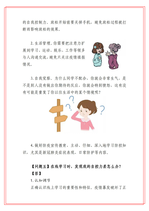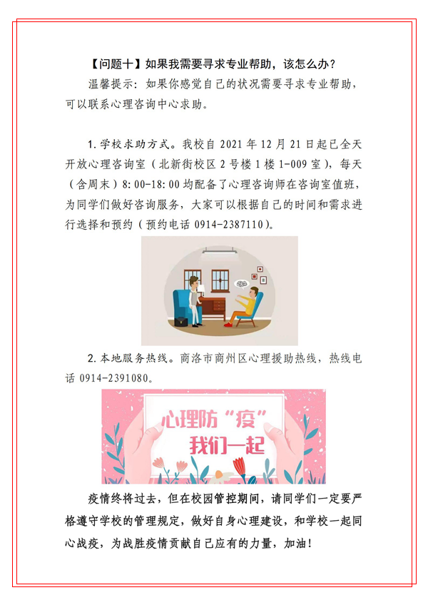 為切實貫徹學校黨委關于做好本輪新冠肺炎疫情防控工作的安排部署,堅決打贏疫情防控阻擊戰(zhàn),健康管理學院積極發(fā)揮學科專業(yè)和人才優(yōu)勢,組織心理學系教師迅速行動,針對防疫期間大學生常見的心理健康問題,編寫了《商洛學院大學生防疫心理健康你問我答》。這些心理健康科普知識緊密結合我校師生實際,圖文并茂、通俗易懂,能夠有效幫助和引導廣大學生調試自己心理狀態(tài),維護身心健康。
