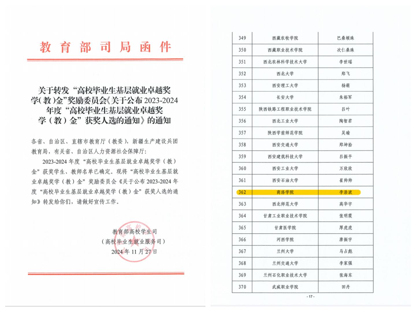 日前,教育部高校學(xué)生司發(fā)布了《關(guān)于公布2023-2024年度“高校畢業(yè)生基層就業(yè)卓越獎(jiǎng)學(xué)(教)金”獲獎(jiǎng)人選的通知》,我?;瘜W(xué)工程與現(xiàn)代材料學(xué)院化學(xué)專業(yè)2018屆畢業(yè)生李浩波赴新疆基層就業(yè)事跡成功入選,獲評(píng)全國(guó)“高校畢業(yè)生基層就業(yè)卓越獎(jiǎng)學(xué)金”,陜西省高校共有12名優(yōu)秀畢業(yè)生獲此殊榮,也是我校畢業(yè)生首次獲得該項(xiàng)獎(jiǎng)勵(lì)。