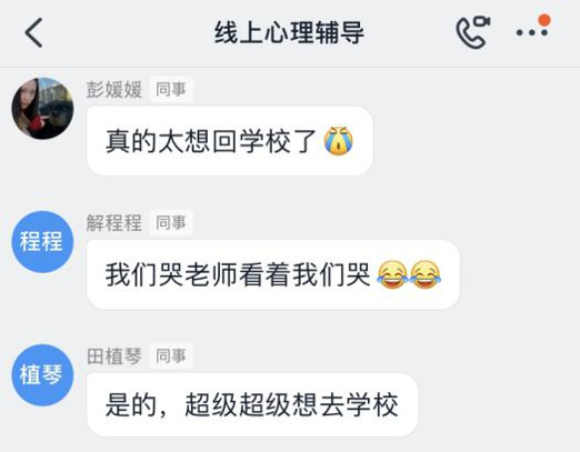 輔導(dǎo)會開展過程中,學(xué)生們積極參與討論,很多學(xué)生表示“超級超級想去學(xué)?!薄爸幌肴ド蠈W(xué)”,當(dāng)然學(xué)生們也會擔(dān)憂自己回學(xué)校就被隔離了,擔(dān)心因為自己是湖北人而受到大家的異樣眼光。輔導(dǎo)老師針對學(xué)生的這些焦慮、恐懼等負(fù)性情緒進(jìn)行了線上輔導(dǎo),學(xué)生們表示“相信咱們的母校、相信咱們偉大的祖國”。