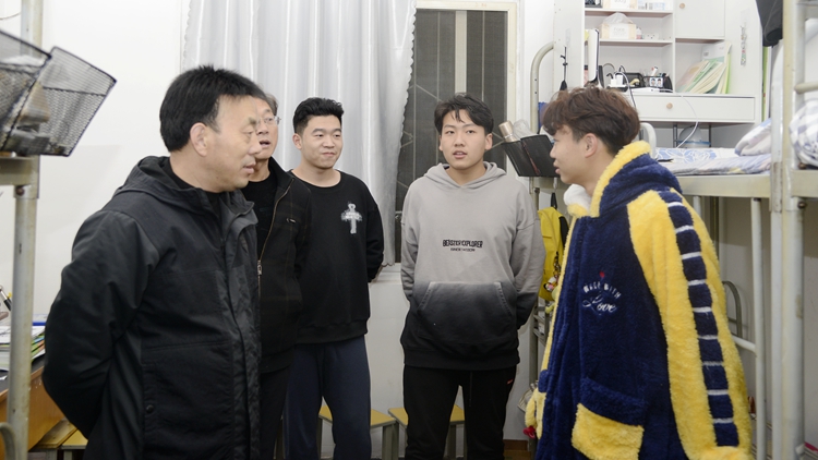 檢查中,彭虎軍詳細查看了公寓出入學生登記冊、輔導員進樓走訪工作臺賬及輔導員值班安排表,并就公寓管理、宿舍文明、宿舍衛(wèi)生、學生教育管理等工作與宿管員及值班輔導員進行了深入交流。在學生宿舍,彭虎軍仔細查看了宿舍環(huán)境、設施安全及衛(wèi)生情況,與學生們親切交談,詢問他們學習生活中的困難和需求、就業(yè)意向及宿舍供暖情況等,叮囑學生要提高安全意識,注意冬季用電安全,遵守公寓安全相關規(guī)定,營造良好的學習和生活環(huán)境。彭虎軍還要求相關部門及二級學院要進一步加強安全隱患排查整治工作,形成常態(tài)化工作機制,解決好突出問題,充分保障學校安全穩(wěn)定大局,確保正常的教育教學秩序。