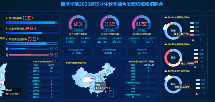 本次網(wǎng)絡(luò)視頻招聘會共有省內(nèi)外320余家用人單位報名參會,提供涉及制造業(yè)、建筑業(yè)、房地產(chǎn)業(yè)、教育、文化體育和娛樂業(yè)、信息傳輸軟件和信息技術(shù)服務(wù)業(yè)、科學(xué)研究和技術(shù)服務(wù)業(yè)等10大行業(yè)領(lǐng)域的對口、優(yōu)質(zhì)就業(yè)崗位6200余個。共吸引1589余名校內(nèi)外畢業(yè)生參會,在線訪問量達到44901人(次),畢業(yè)生累計投遞簡歷4019份。