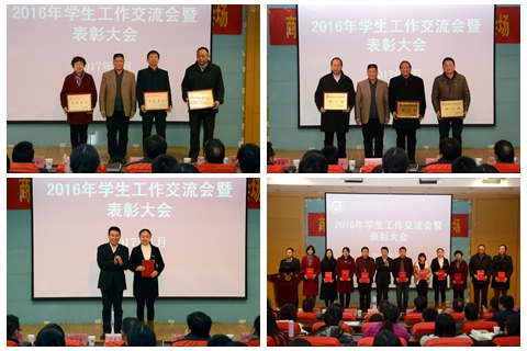 大會對2015-2016年度省級優(yōu)秀輔導(dǎo)員趙萍,生物學(xué)院等3個(gè)2016年學(xué)生工作考核先進(jìn)集體、魯綿茸等11名學(xué)生工作先進(jìn)個(gè)人、李嬙等29名優(yōu)秀班主任,經(jīng)管學(xué)院等3個(gè)就業(yè)工作先進(jìn)集體、王正良等13名就業(yè)工作先進(jìn)個(gè)人,張俊華撰寫的《建國以來青少年偶像崇拜問題的基本脈絡(luò)及其思考》等16篇學(xué)生工作研究優(yōu)秀論文,李馥利等30位輔導(dǎo)員、班主任的優(yōu)秀學(xué)生工作日志進(jìn)行了表彰。在熱烈的掌聲中,范新會、彭虎軍為獲獎(jiǎng)集體和個(gè)人代表頒發(fā)了獎(jiǎng)牌、證書。在校學(xué)生代表為優(yōu)秀班主任頒發(fā)了證書。