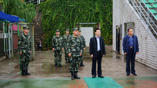 9月18日,武警陜西省總隊(duì)副參謀長(zhǎng)連文生大校、武警商洛支隊(duì)支隊(duì)長(zhǎng)王平上校、武警商洛支隊(duì)政委梁棟上校一行冒雨來我校視察慰問承訓(xùn)教官與參訓(xùn)師生。黨委副書記彭虎軍陪同檢查。