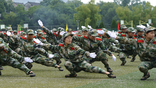 分列式結(jié)束后,軍訓(xùn)教官和學(xué)生進(jìn)行了格斗、匕首操、五步拳匯報(bào)表演。教官們精彩的格斗表演氣勢(shì)威猛如虎、出手灑脫有力,盡展果敢剛強(qiáng)的軍人本色,讓人熱血沸騰;女兵們表演的匕首操動(dòng)作整齊、聲音洪亮,完美詮釋了“巾幗不讓須眉”的豪情壯志;全體參訓(xùn)學(xué)生共同完成的五步拳表演扎實(shí)穩(wěn)健、氣勢(shì)磅礴,展現(xiàn)了我校學(xué)子昂揚(yáng)的青春斗志,引起了現(xiàn)場(chǎng)師生陣陣歡呼與掌聲。