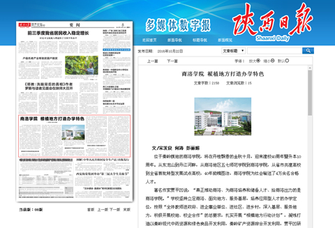 10月22日,《陜西日?qǐng)?bào)》以《商洛學(xué)院 根植地方打造辦學(xué)特色》為題對(duì)我校辦學(xué)成就進(jìn)行報(bào)道。文章從“聚焦現(xiàn)代中藥和綠色食品做文章,瞄準(zhǔn)秦嶺礦產(chǎn)資源綜合利用下功夫,寫商洛 畫商洛 打造秦嶺最美名片”三個(gè)方面,回顧了我校建校40年、升本10年來,堅(jiān)持立足商洛、面向地方、服務(wù)基層,凝練打造以秦嶺現(xiàn)代中藥資源和綠色食品開發(fā)利用,秦嶺礦產(chǎn)資源綜合開發(fā)利用,賈平凹研究、秦嶺畫派等地方文化傳承創(chuàng)新為代表的辦學(xué)特色,深入開展“根植地方行動(dòng)計(jì)劃”的實(shí)踐和成果。