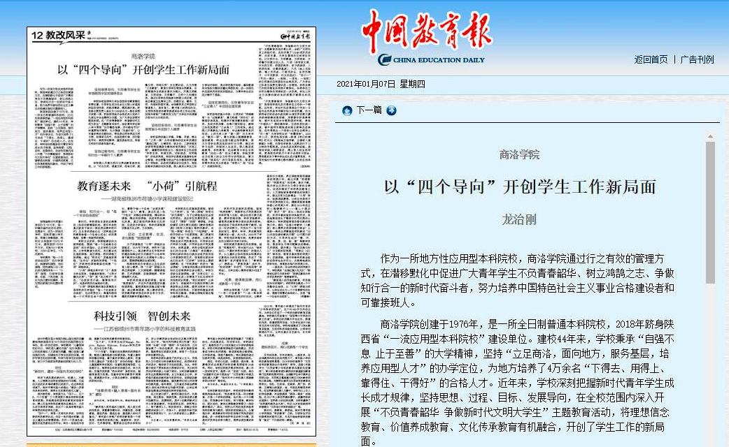 1月7日,校黨委書記龍治剛在《中國教育報》教改風采版面發(fā)表署名文章《商洛學(xué)院:以“四個導(dǎo)向”開創(chuàng)學(xué)生工作新局面》。