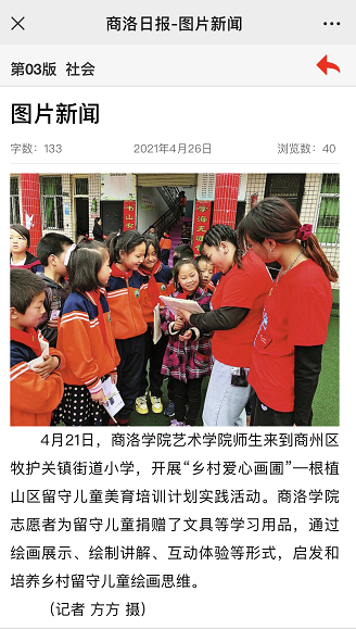4月26日,商洛日報三版社會版面對我校承擔的公益項目“鄉(xiāng)村愛心畫圃”走進商州區(qū)牧戶關(guān)街道小學開展公益活動進行了報道,原文如下: