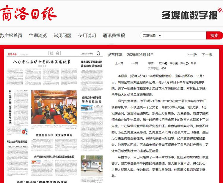 余鑫表示,自己只是做了一件平常的小事,把撿到的東西物歸原主罷了。誠實守信是中華民族的傳統(tǒng)美德,做人要不貪不占、將心比心,小善才能聚大愛。作為教師,更要以身作則,體現(xiàn)高校教師的基本素養(yǎng)。