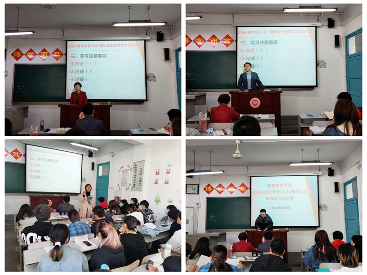 根據(jù)我校畢業(yè)生實(shí)習(xí)相關(guān)要求和學(xué)院工作安排。4月2日,健康管理學(xué)院召開(kāi)應(yīng)用心理學(xué)專業(yè)2023屆畢業(yè)生教育實(shí)習(xí)動(dòng)員會(huì),62名實(shí)習(xí)生將奔赴商洛中學(xué)、商洛市小學(xué)等7所中小學(xué)校,開(kāi)展為期12周的教育實(shí)習(xí)。黨總支書記魯綿茸出席會(huì)議并講話,實(shí)習(xí)指導(dǎo)教師、輔導(dǎo)員、2023屆應(yīng)用心理學(xué)專業(yè)全體畢業(yè)生參加動(dòng)員會(huì),會(huì)議由心理學(xué)系主任梁豐主持。