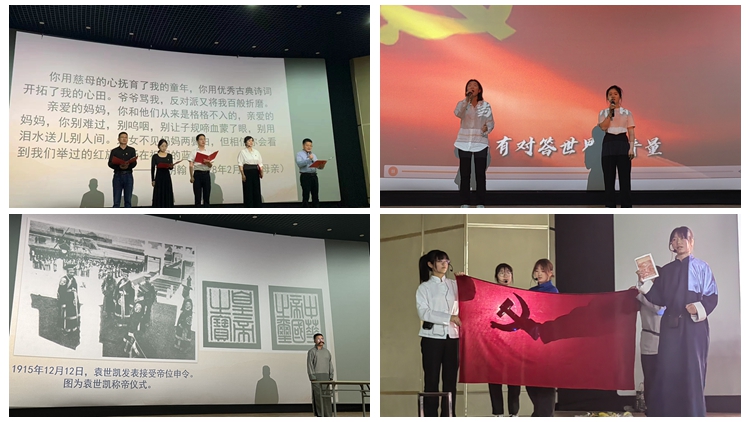 在雄壯激昂的中國共產(chǎn)主義青年團團歌合唱聲中,展演活動拉開了帷幕。數(shù)學(xué)2201班、2204班聯(lián)袂表演的舞臺劇《戊戌變法》,講述了戊戌變法的始末,展現(xiàn)了資產(chǎn)階級維新派挽救民族危亡的努力,譚嗣同“愿以頸血刷污政”視死如歸的精神使觀眾動容。漢語2201班表演的舞臺劇《播火者——李大釗》,演繹了李大釗傳播馬克思主義的火種,與陳獨秀相約建黨,為喚醒民眾,犧牲小家庭的幸福,斗爭到最后一刻的頑強革命精神。馬克思主義學(xué)院教工第一黨支部黨員李寶寶、安梅、劉健、楊茜、宋秀方帶來的《紅色書信》朗誦,用深情帶領(lǐng)觀眾追溯夏明翰、楊開慧、方志敏、趙一曼、左權(quán)等先輩的革命道路,以信仰為方向,領(lǐng)航新時代青年愛國奮進。漢語2202班演繹的舞臺劇《烈火中永生》講述了在重慶解放前夕,共產(chǎn)黨員江竹筠在重慶渣滓洞集中營受盡酷刑折磨,始終堅貞不屈,在黎明前壯烈犧牲的故事。數(shù)學(xué)2203班表演的舞臺劇《劉集村的故事》,演繹了陳望道翻譯的《共產(chǎn)黨宣言》首個中文全譯本在山東省東營市廣饒縣大王鎮(zhèn)劉集村得以保存、傳播、生根的故事。數(shù)學(xué)2202班表演的舞臺劇《戰(zhàn)疫“情”》以“全國抗擊新冠肺炎疫情先進個人”榮譽稱號獲得者杜富佳為原型,演繹了在突如其來的疫情面前,杜富佳與哥哥杜富國的兄妹情、與戰(zhàn)友的同事情、與患者的醫(yī)患情,再現(xiàn)了年輕醫(yī)護人員用生命、熱血和信仰所鑄就的不畏艱難、治病救人的形象。音樂學(xué)2203班馬靖瑋、范佳怡演唱的歌曲《有我》,再現(xiàn)了百年以來作為實現(xiàn)民族復(fù)興的先鋒力量,青年不懈追求的夢想始終與振興中華的責(zé)任擔(dān)當(dāng)緊密相連的歷程,發(fā)出“那未來如何登場,有我擔(dān)當(dāng),定是你只能叫好!”的時代強音。