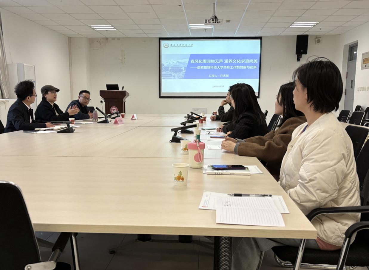 在美育講座中,陜西省高校美育教指委副主任兼秘書長(zhǎng)、西安建筑科技大學(xué)文化藝術(shù)教育中心主任許志敏受邀為我校美育工作辦公室、公共藝術(shù)教育中心相關(guān)成員及藝術(shù)學(xué)院相關(guān)負(fù)責(zé)人作題為《春風(fēng)化雨潤(rùn)物無聲、涵養(yǎng)文化求真尚美——西安建筑科技大學(xué)美育工作的發(fā)展與創(chuàng)新》的報(bào)告,她結(jié)合高校美育工作經(jīng)驗(yàn),就高校如何遵循美育特點(diǎn)面向全體學(xué)生開展美育工作分享了多元化創(chuàng)新實(shí)施路徑。許志敏提出要發(fā)掘非藝術(shù)專業(yè)學(xué)生的審美需求和藝術(shù)潛能,加強(qiáng)學(xué)生藝術(shù)社團(tuán)在美育活動(dòng)中的引領(lǐng)作用。在互動(dòng)交流環(huán)節(jié),與會(huì)教師就我校美育工作核心任務(wù)、美育師資隊(duì)伍建設(shè)、美育課程建設(shè)等問題與許志敏深入交流,現(xiàn)場(chǎng)氣氛熱烈。