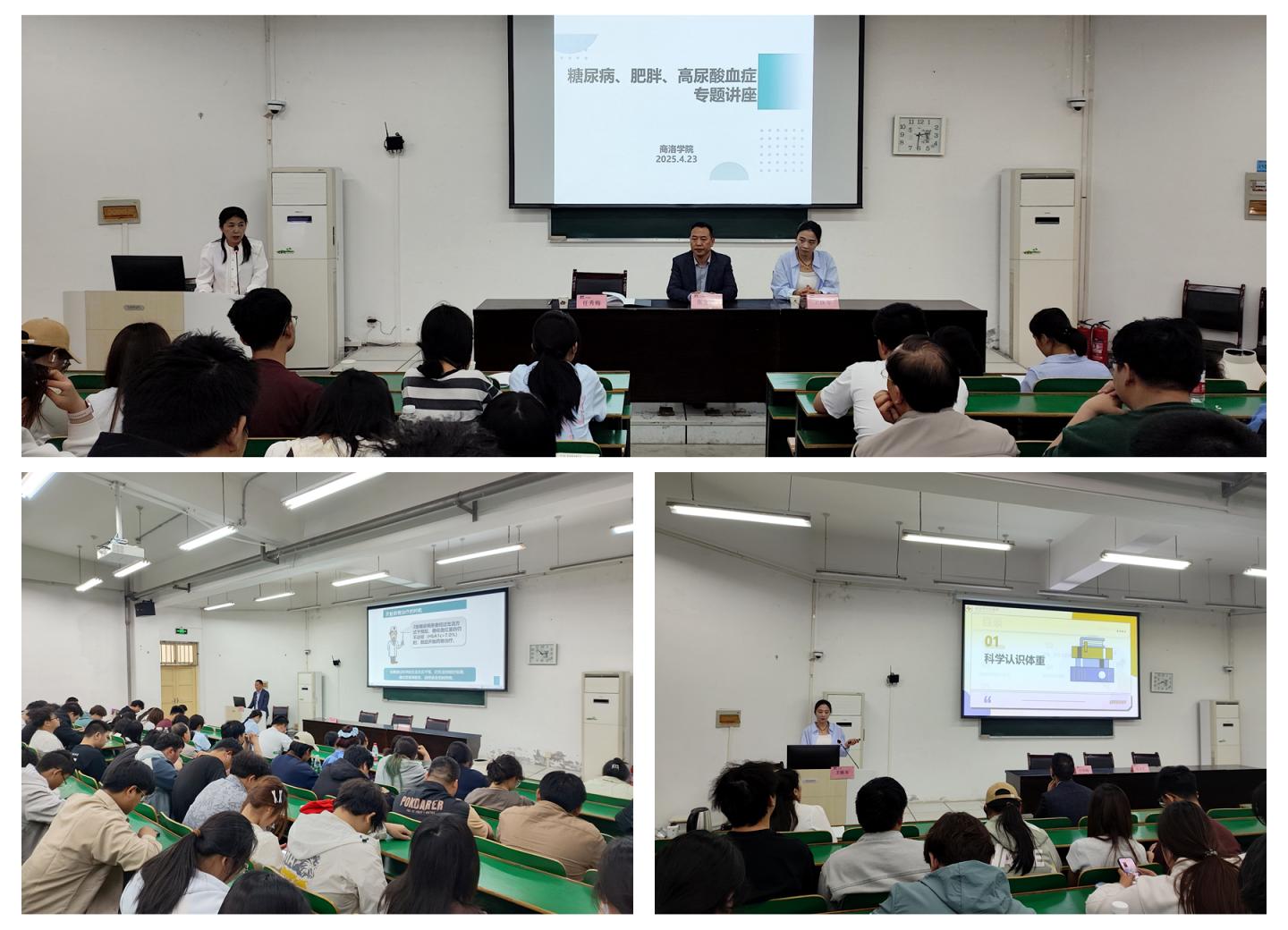 為關(guān)愛我校師生健康,進(jìn)一步普及疾病防治知識,4月23日,商洛市中心醫(yī)院內(nèi)分泌科兼營養(yǎng)科主任張友杰主任醫(yī)師、營養(yǎng)科衛(wèi)姝岑醫(yī)師受邀為我校師生作糖尿病、肥胖、高尿酸血癥防治專題講座。校醫(yī)院全體醫(yī)務(wù)人員及近百名師生參加了本次講座,講座由校醫(yī)院院長任秀梅主持。