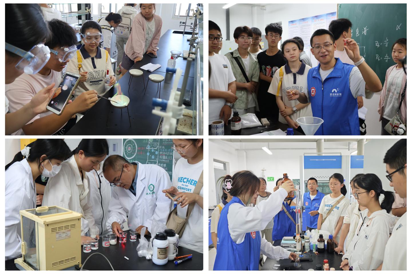 在無機化學(xué)實驗室,高霞博士以“點亮化學(xué)之光 —— 焰色反應(yīng)實驗探秘” 為主題,從原子結(jié)構(gòu)與電子躍遷理論出發(fā),解析鈉、鉀等金屬鹽溶液灼燒顯色的科學(xué)原理,結(jié)合礦物分析等生活實例,帶領(lǐng)學(xué)生領(lǐng)略化學(xué)視覺奇觀,實驗師劉萍指導(dǎo)學(xué)生完成實驗,辨識不同金屬焰色。有機化學(xué)實驗室中,王以壽博士以 “薄層色譜、柱色譜分離技術(shù) —— 色素的高效分離” 為核心,結(jié)合蘇丹紅檢測等科研實例,講解色譜技術(shù)在食品安全等領(lǐng)域的應(yīng)用,學(xué)生在志愿者協(xié)助下體驗染料分離實驗。物理化學(xué)實驗室內(nèi),劉永亮博士以牛奶等生活膠體現(xiàn)象為切入點,指導(dǎo)學(xué)生制備膠體,觀察丁達爾效應(yīng)等現(xiàn)象,理解膠體應(yīng)用價值?;瘜W(xué)教學(xué)論實驗室里,史景濤博士以橙子等為樣本,帶領(lǐng)學(xué)生開展實驗,通過果汁對高錳酸鉀溶液的還原反應(yīng),探究維生素 C 還原性及酸度影響,搭建學(xué)科認知橋梁。