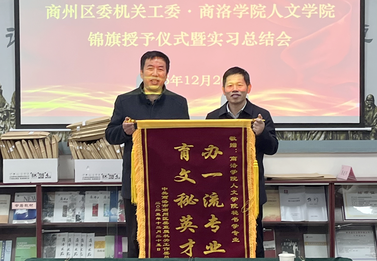 會(huì)議伊始,商州區(qū)委機(jī)關(guān)工委向人文學(xué)院授予錦旗,對(duì)人文學(xué)院秘書學(xué)專業(yè)實(shí)習(xí)生在實(shí)踐崗位展現(xiàn)出的專業(yè)素養(yǎng)、務(wù)實(shí)作風(fēng)和良好精神風(fēng)貌表示高度認(rèn)可與誠摯感謝。金紅衛(wèi)和張文諾分別代表各自單位授旗和接旗。